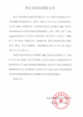 202201-22我司于2021年10月29日授权域名(主域名:www.92f.com)在中国大陆地区范围内提供运营、管理、推广《The Legend Of Mir...